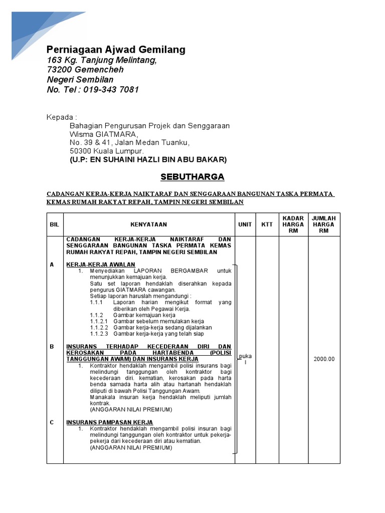 Bil Perkara Unit Kuantiti Kadar Harga 1 2 3 3 1 3 2 3 3 3 4 3 5 Syarat